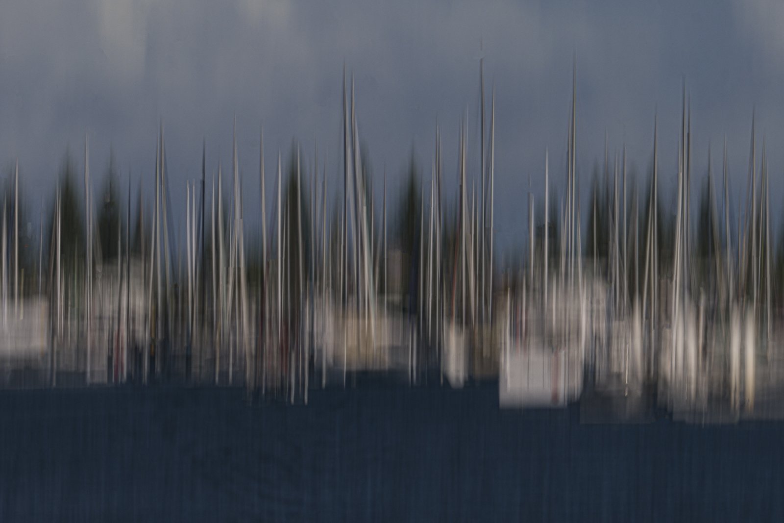 Sailing boats are lined up at a marina, slightly blurred against a backdrop of dark water and an overcast sky in the late afternoon light, creating a tranquil atmosphere.