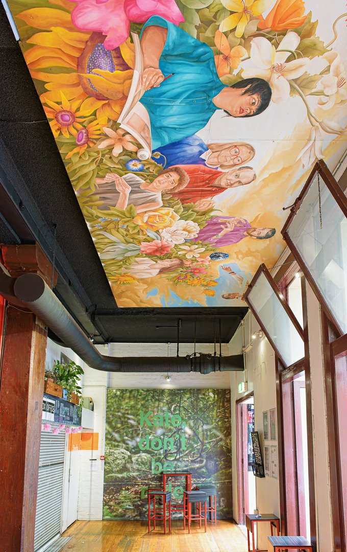 A colorful mural on the ceiling showcases people involved in gardening, surrounded by flowers. The interior has wooden seating and a nature-themed wall, creating a warm atmosphere.