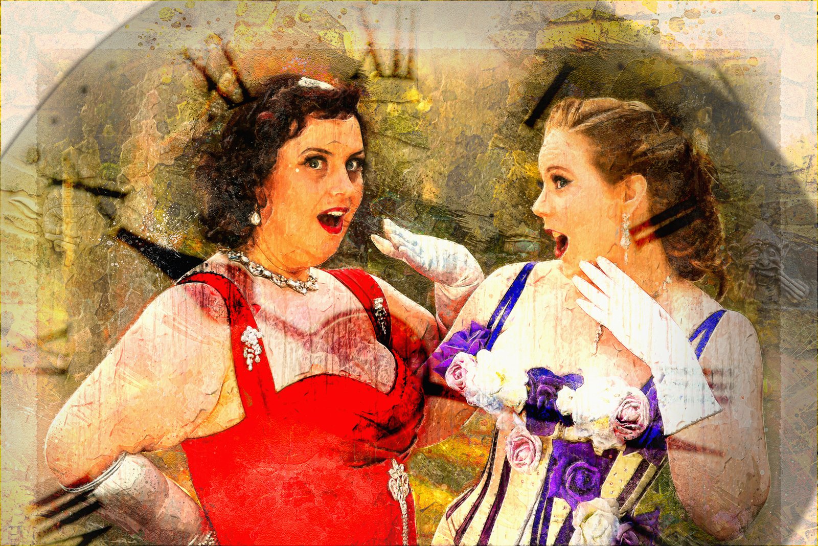 Two joyous performers, dressed in colorful costumes with intricate details, engage in lively conversation. They stand against a vintage clock backdrop, creating a theatrical atmosphere.