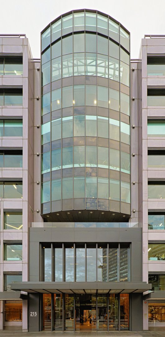 A contemporary office building features large glass panels and a striking entrance. Located in a bustling city, the architecture reflects modern design principles and urban lifestyle.