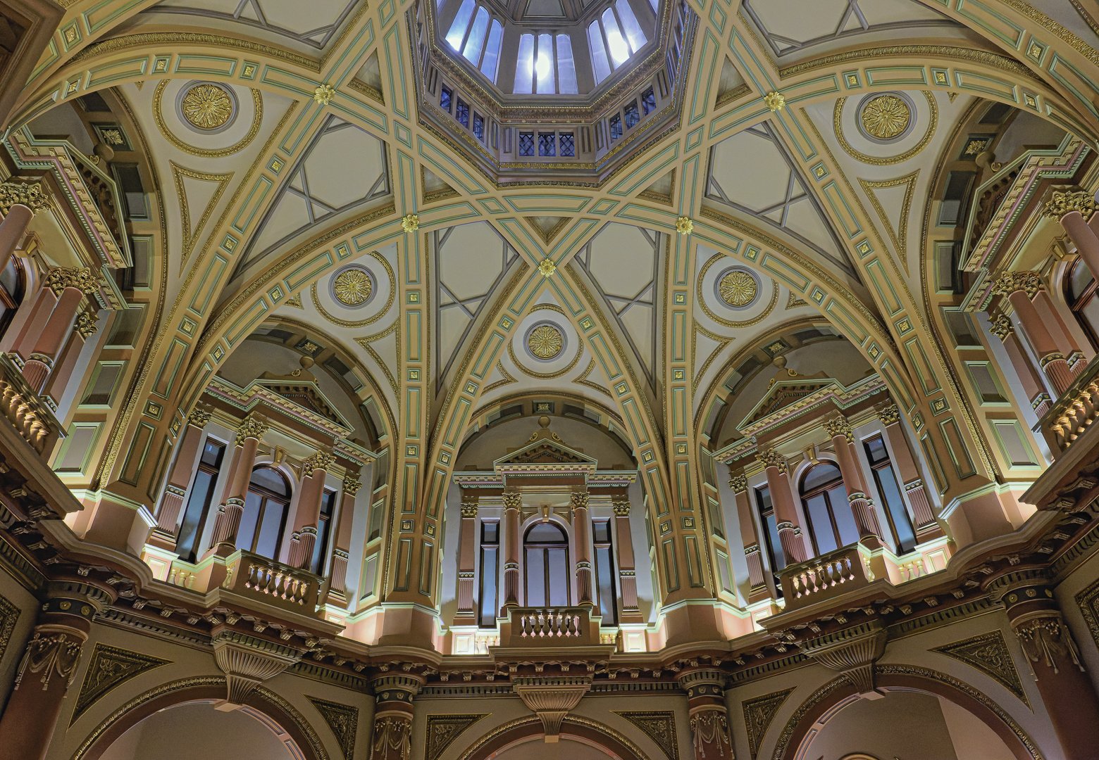 Intricate patterns and golden accents of a ceiling showcase stunning architectural design in a historical building. Natural light filters through the glass dome, enhancing the elegance.