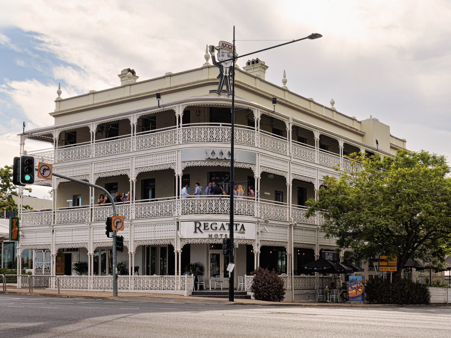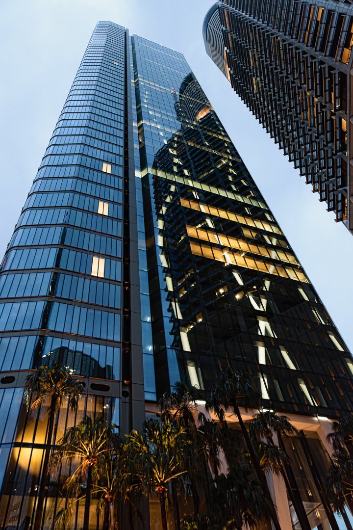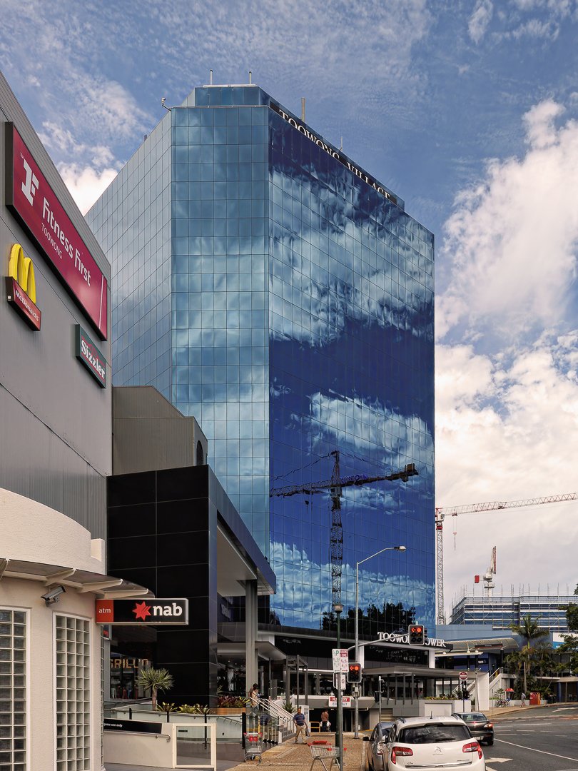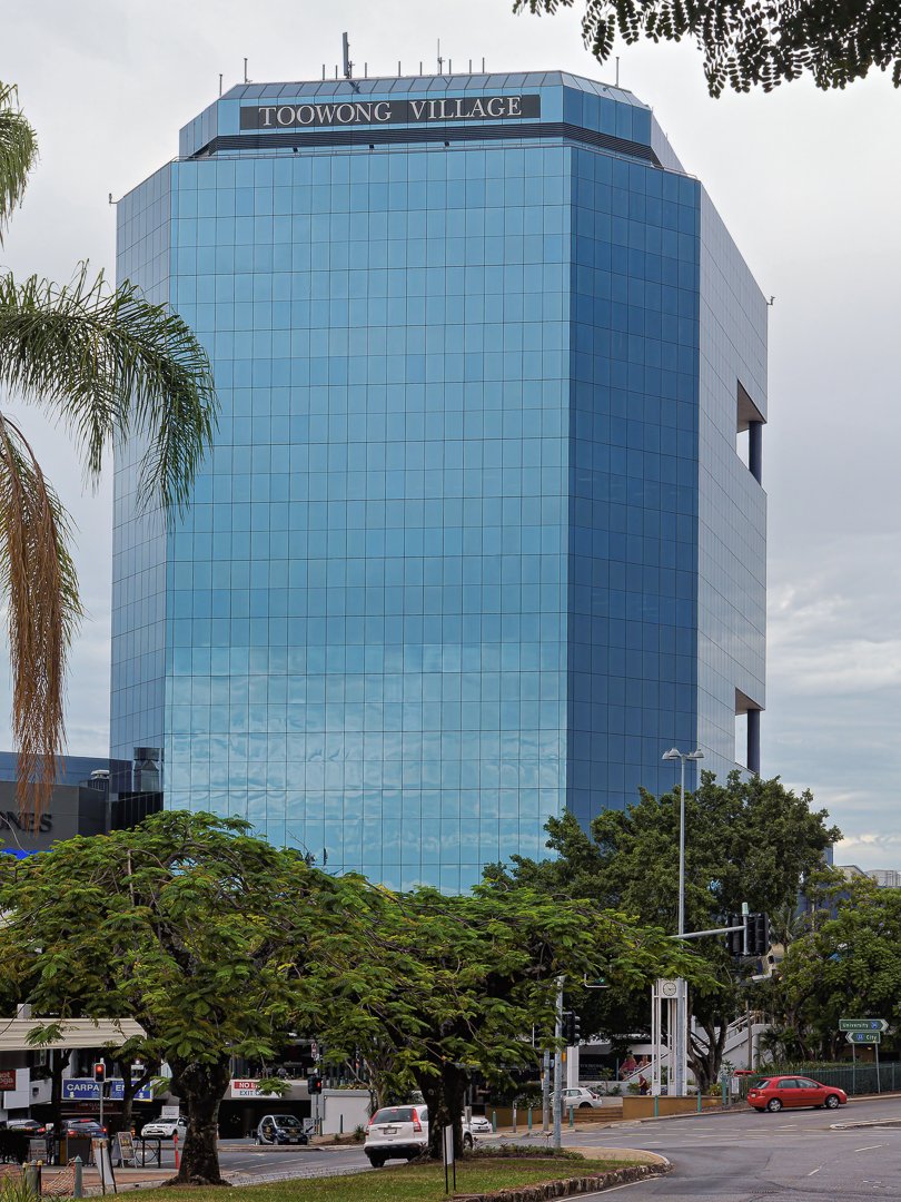 A modern building stands prominently in Toowong, Brisbane, showcasing sleek blue glass architecture. Surrounding palm trees and greenery add a touch of nature to the urban landscape.