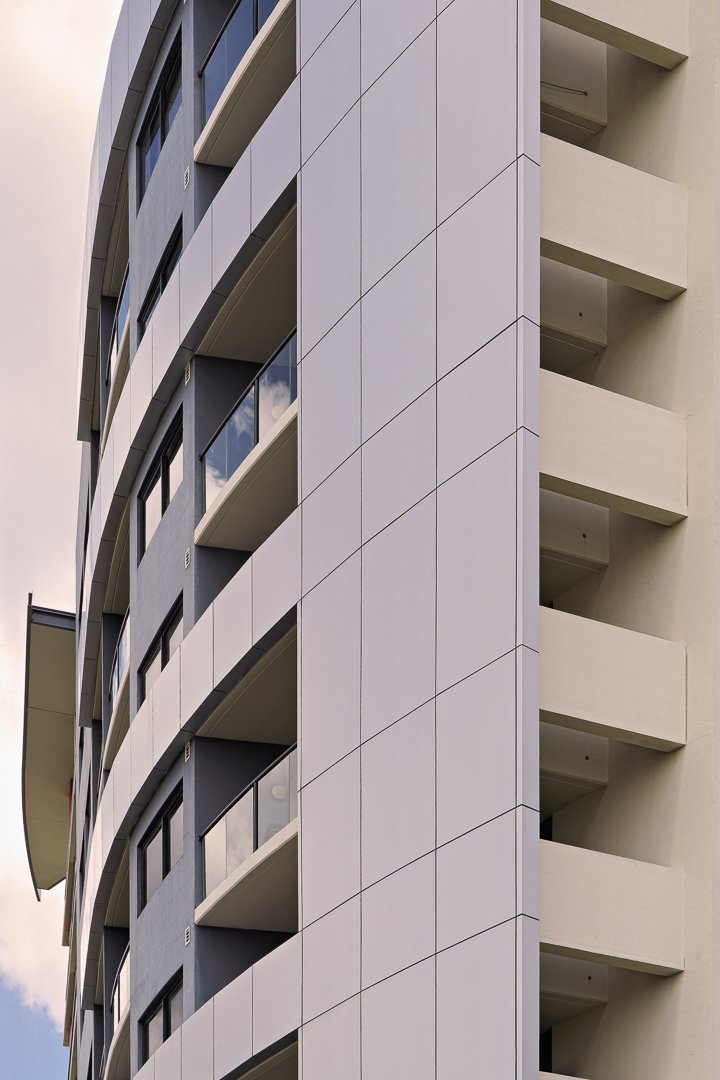 A contemporary residential building features a sleek curved facade with large windows and balconies. The design reflects a modern urban style perfect for city living.