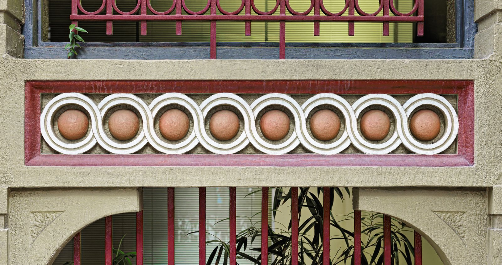 Intricate circular designs enhance the facade of a building, showcasing architectural creativity. The vibrant colors and patterns add character to the urban landscape.
