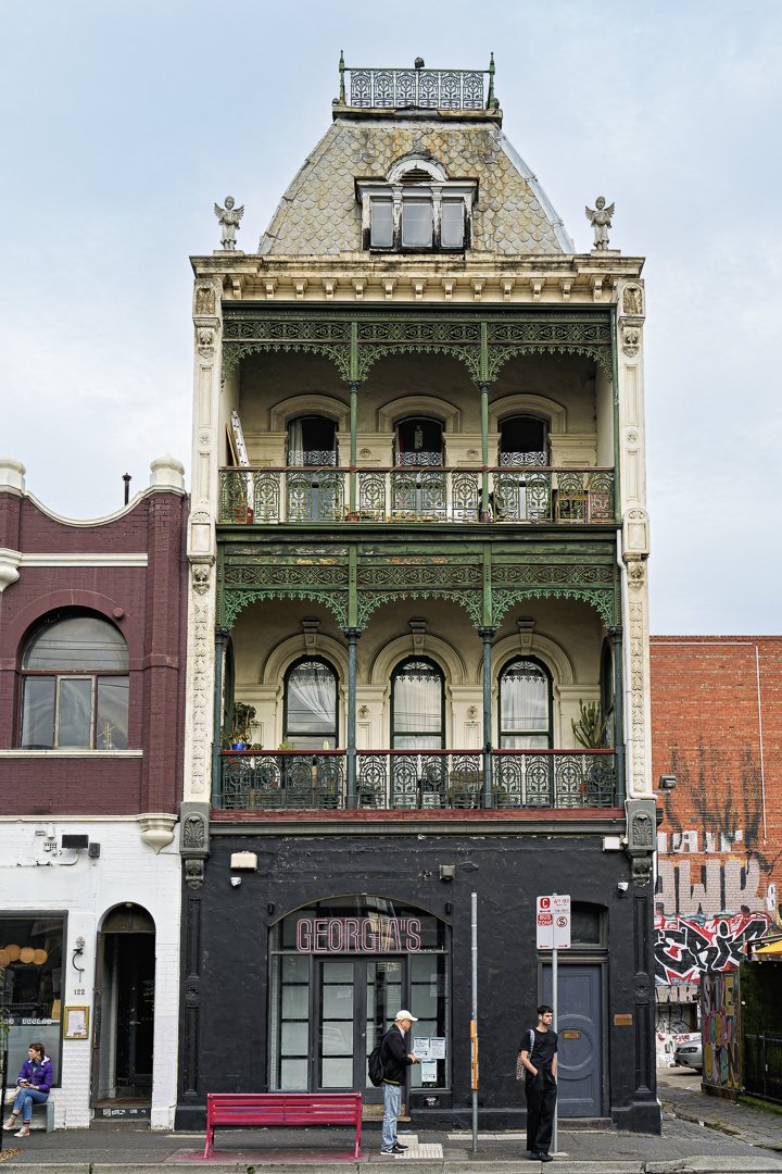 A beautifully designed historic building featuring intricate balconies stands tall amidst modern street art and urban life. People walk by, enjoying the vibrant atmosphere of the city.