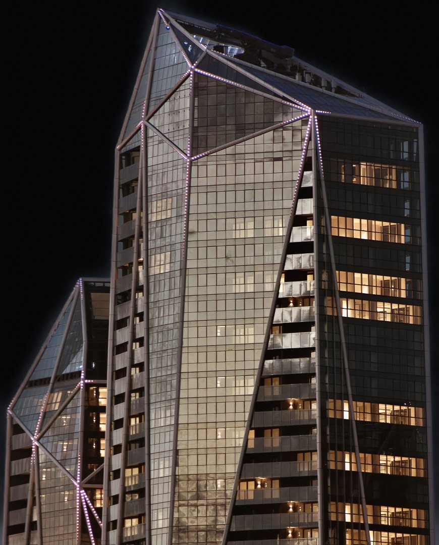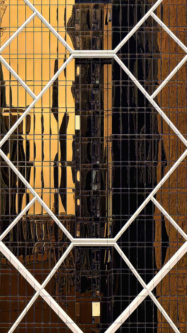 A striking blend of geometric shapes and reflective surfaces adorns the facade of contemporary buildings in a bustling city. The play of light enhances the visual appeal.