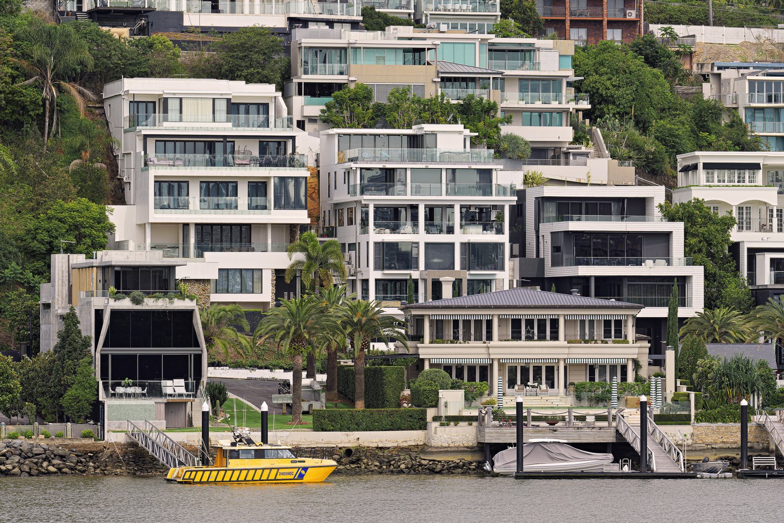 Expansive waterfront properties showcase modern designs and lush landscaping. A vibrant boat navigates the calm waters, reflecting a serene lifestyle in an upscale neighborhood.