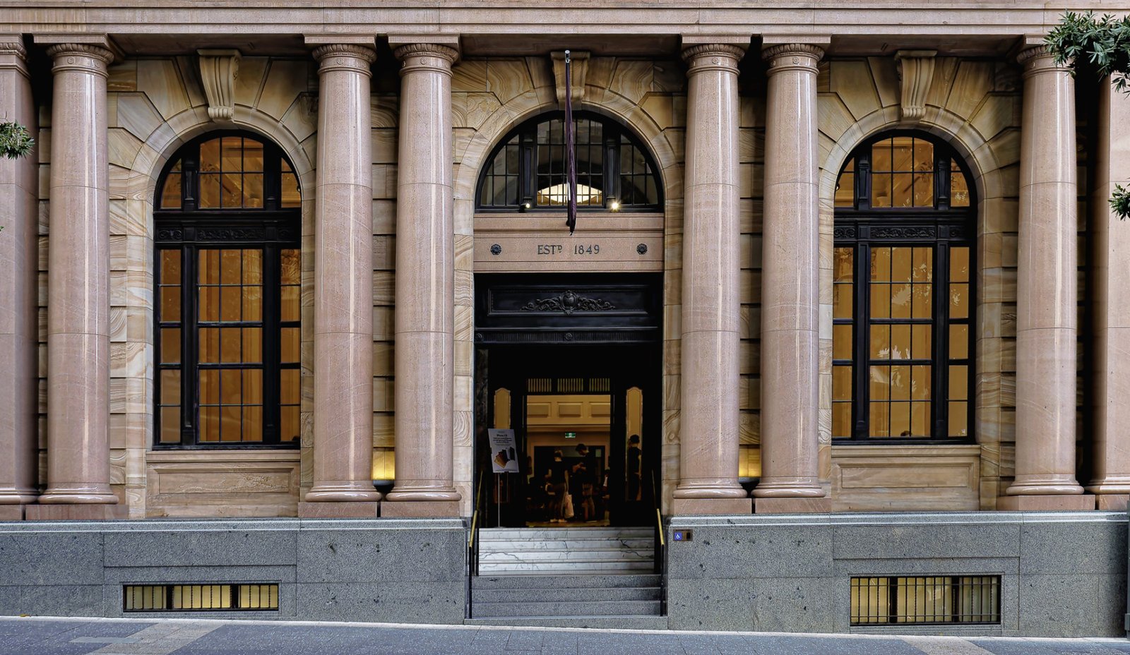An impressive architectural structure features tall columns and a grand entrance. The building showcases a blend of historical charm and urban character, inviting visitors inside.