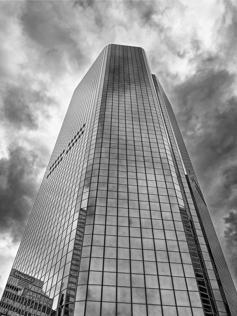 A towering glass skyscraper dominates the city landscape, its sleek surface mirroring the dark, moody clouds overhead. This striking architecture stands against an urban backdrop in late afternoon.