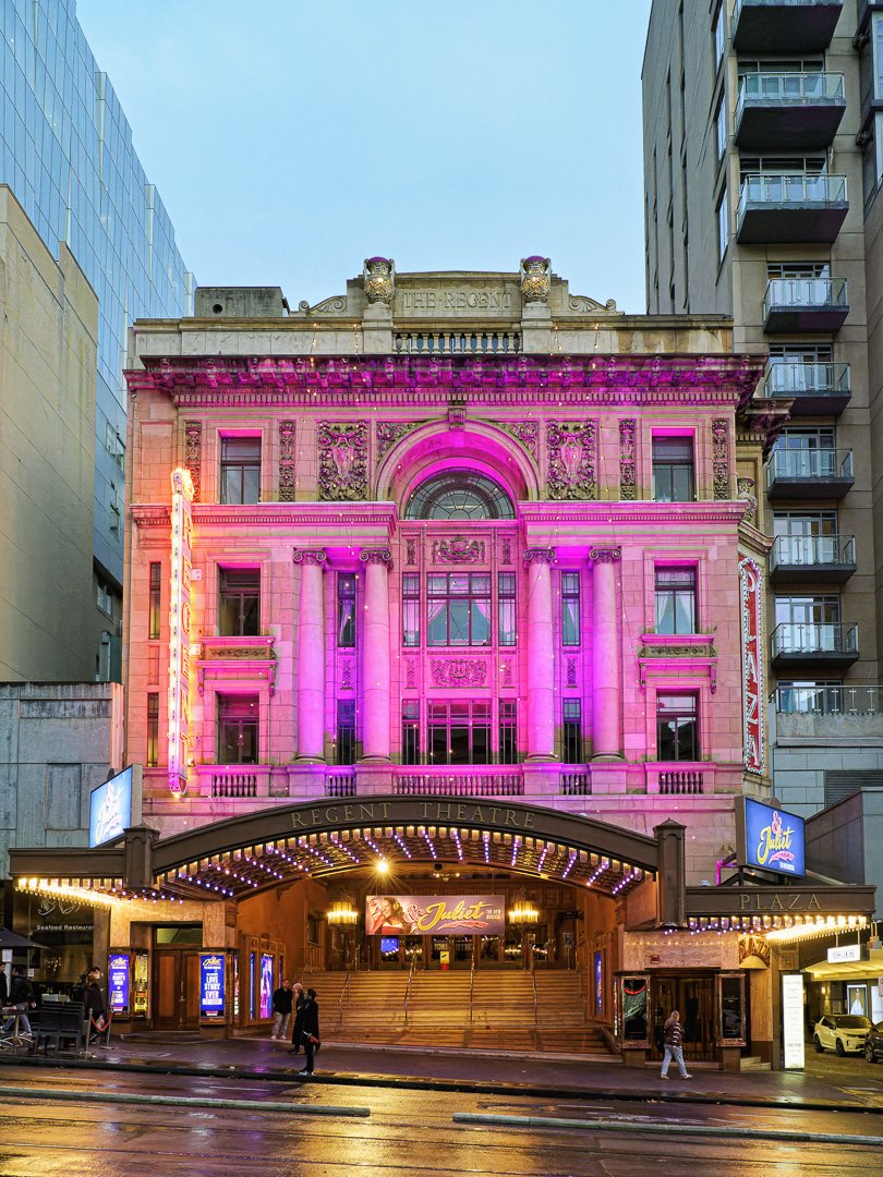 The elegant theater stands prominently in the city as bright lights reflect on the wet pavement below. People walk by, enjoying the city's vibrant evening atmosphere.