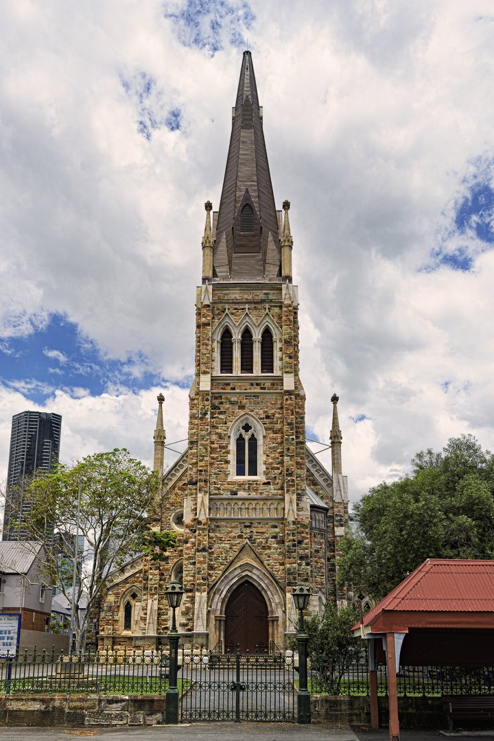 A large stone church featuring intricate details and pointed spires looms over the urban landscape, surrounded by trees and modern buildings under a cloudy sky.