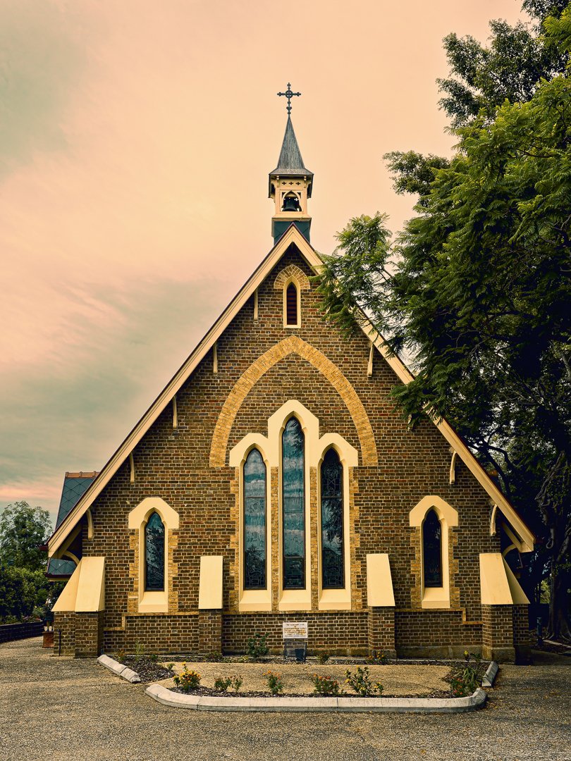 A beautiful stone church features striking Gothic elements, surrounded by greenery. The sky is overcast, creating a peaceful atmosphere that enhances the site’s historical charm.