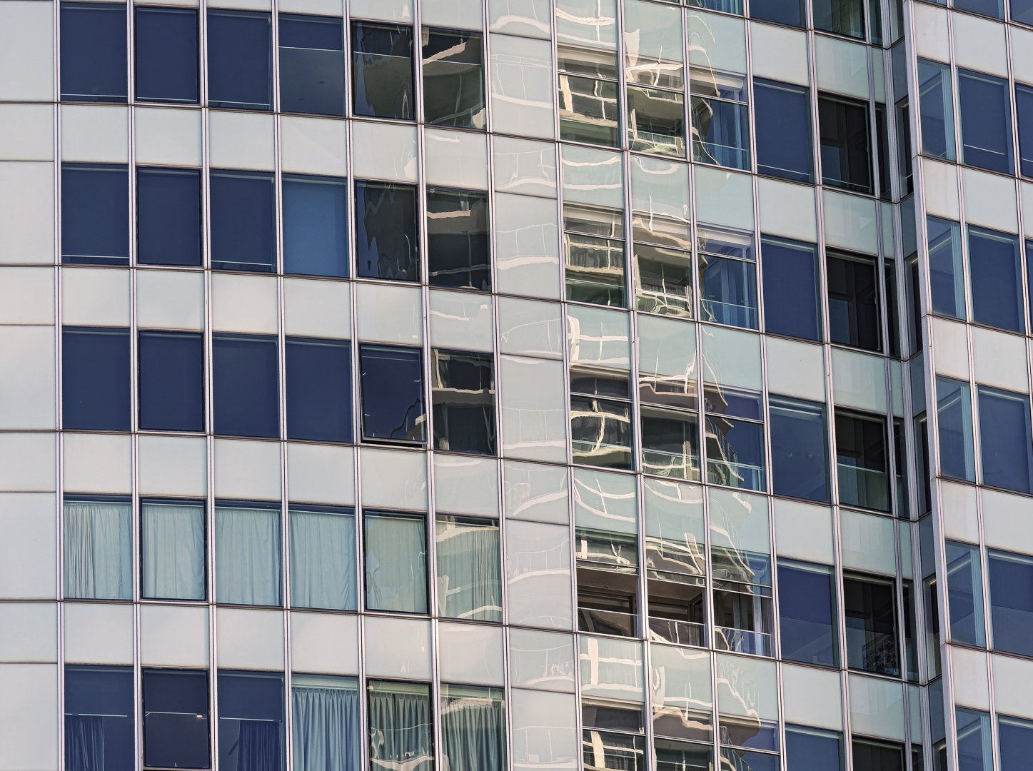 Tall modern building reflects its design in the glass of another structure. The clear blue sky adds contrast to the urban landscape during daytime.