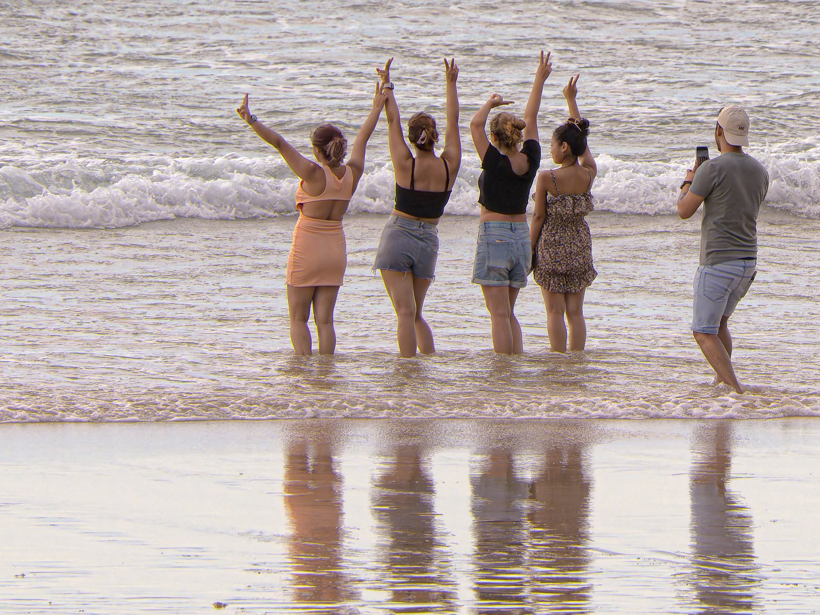 A group of five friends stand in shallow water, smiling and waving. They are enjoying a beach day, taking a moment to capture their joyful memories against a stunning ocean backdrop.