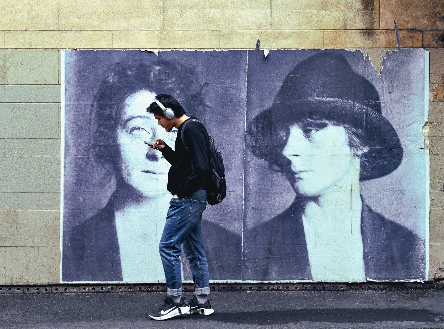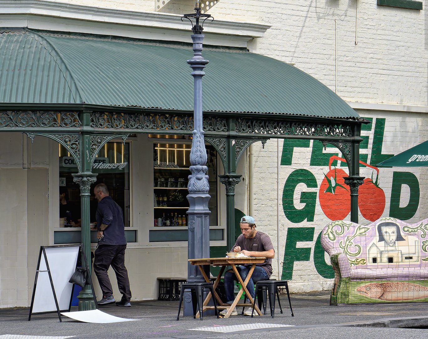 People are enjoying their meals outdoors at a cafe, surrounded by an eye-catching mural. One customer is seated at a small table while another is at the counter.