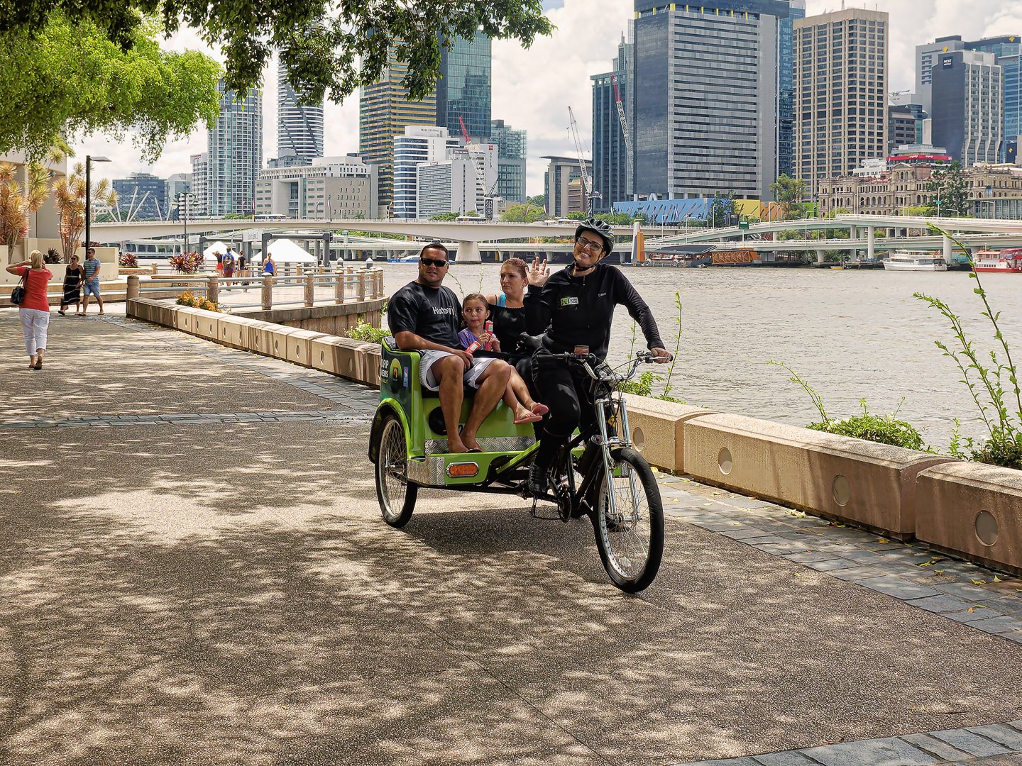 A family rides a green tricycle along the Brisbane River with a cityscape backdrop. They appear relaxed and cheerful under the sunny sky, enjoying their time together.