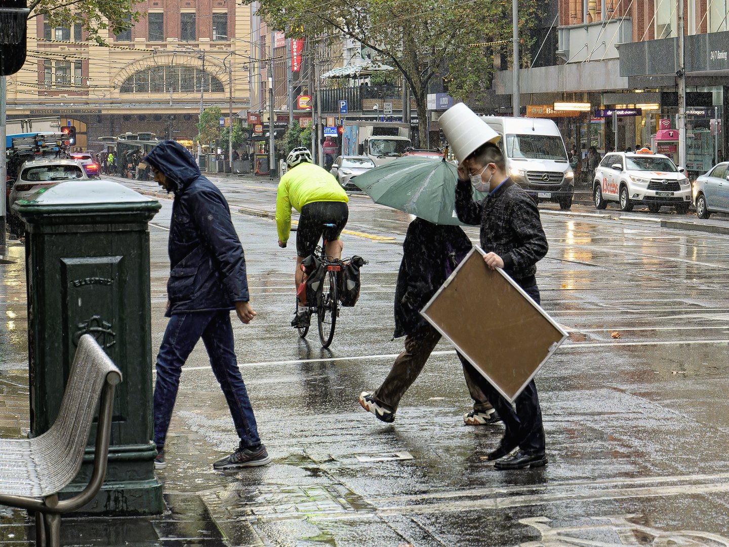 On a rainy day, pedestrians walk through puddles while others ride bicycles. A man carries a sign, and everyone wears rain gear amidst a bustling city backdrop.