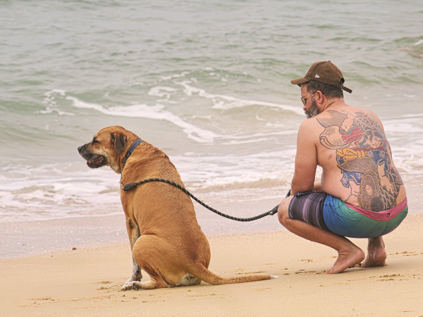 A man with a colorful tattoo squats beside his dog on a sandy beach. They both gaze at the calm ocean waves, enjoying the warmth of a sunny day together.