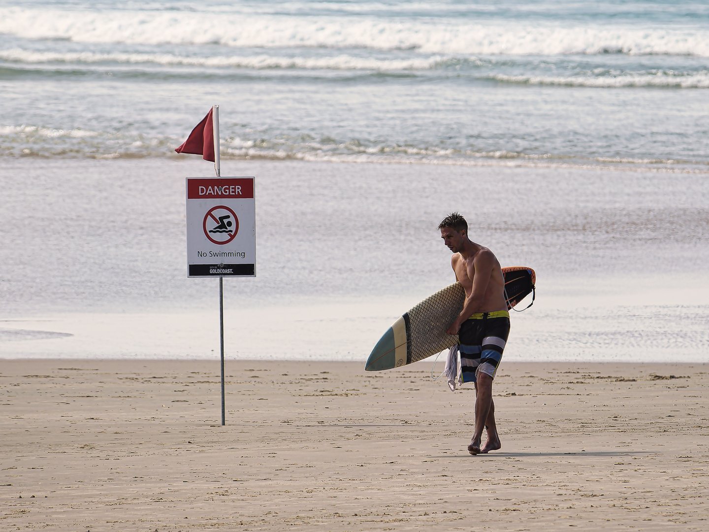 A man carrying a surfboard strolls along a sandy beach, passing a warning sign indicating dangerous conditions for swimming. The ocean waves are visible in the background.