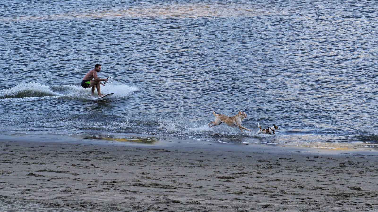 This lively moment captures a man skillfully surfing in shallow water as two dogs joyfully run alongside him on the sandy beach during sunset.