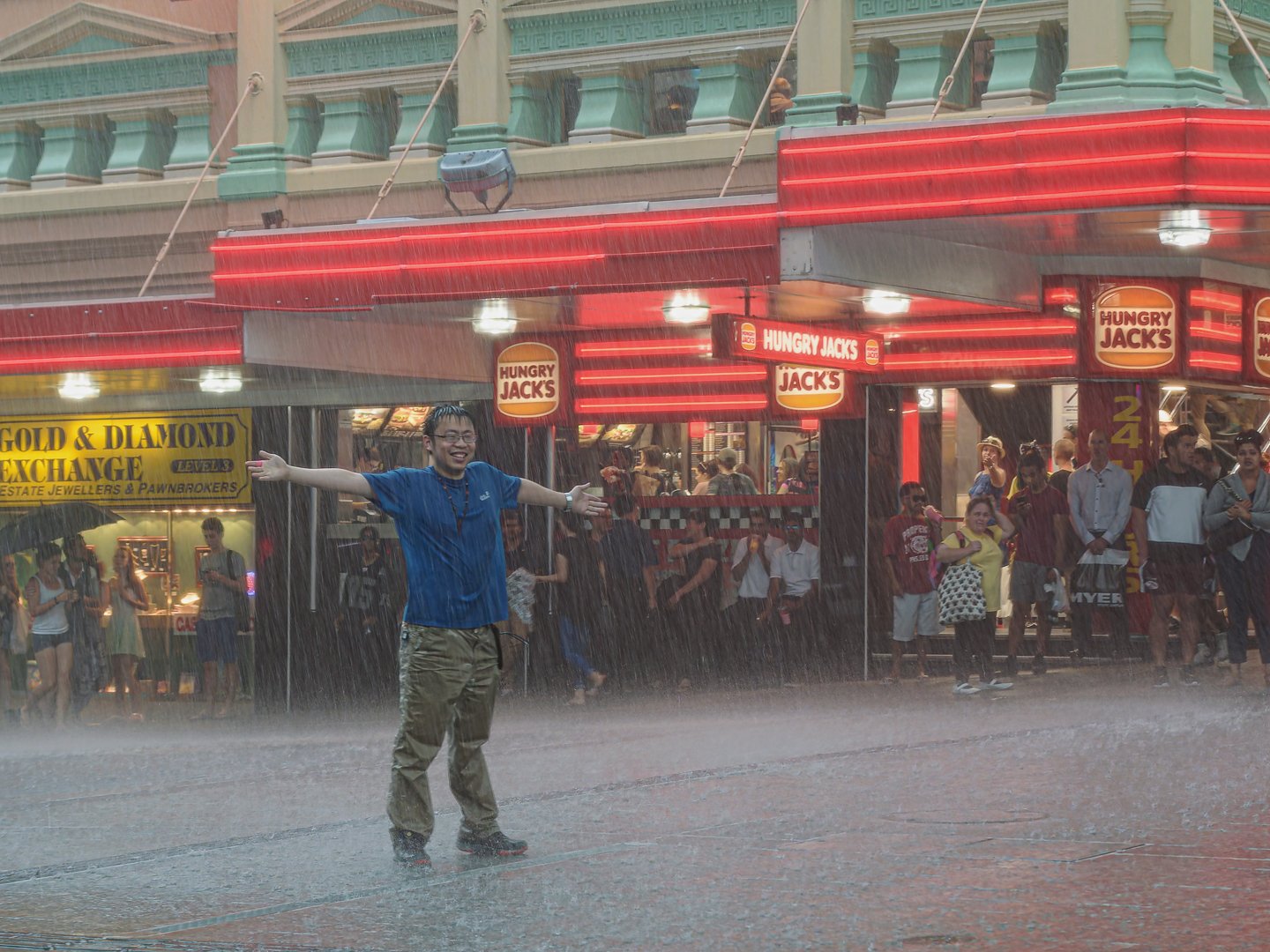 A man stands joyfully in heavy rain on a vibrant city street, surrounded by neon lights and curious onlookers seeking shelter from the downpour.