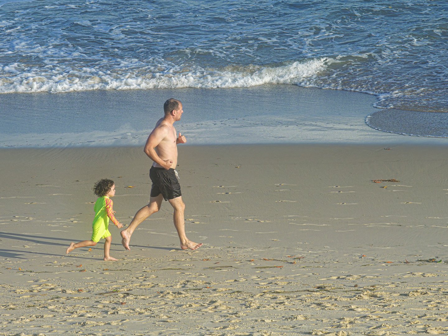 A man and a young girl are joyfully running along the shoreline. The scene captures the carefree spirit of a sunny day at the beach, with gentle waves in the background.