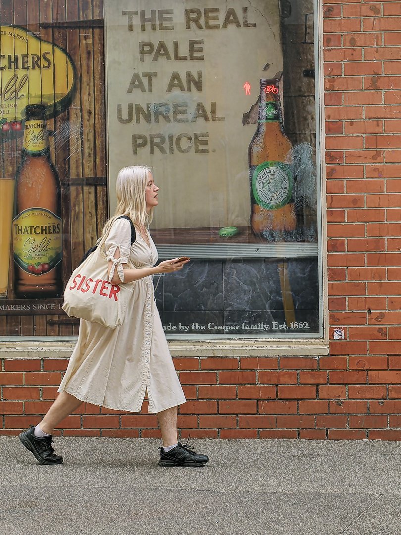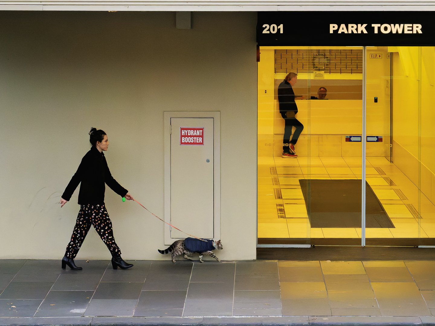 A woman in a black outfit walks her cat on a leash along the sidewalk next to Park Tower. A person is visible inside the building, with a bright yellow backdrop.
