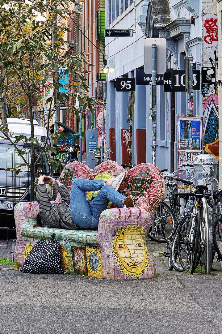 A person relaxes on a colorful mosaic couch situated in a lively urban area, surrounded by bicycles, vibrant street art, and charming shops in the daytime.
