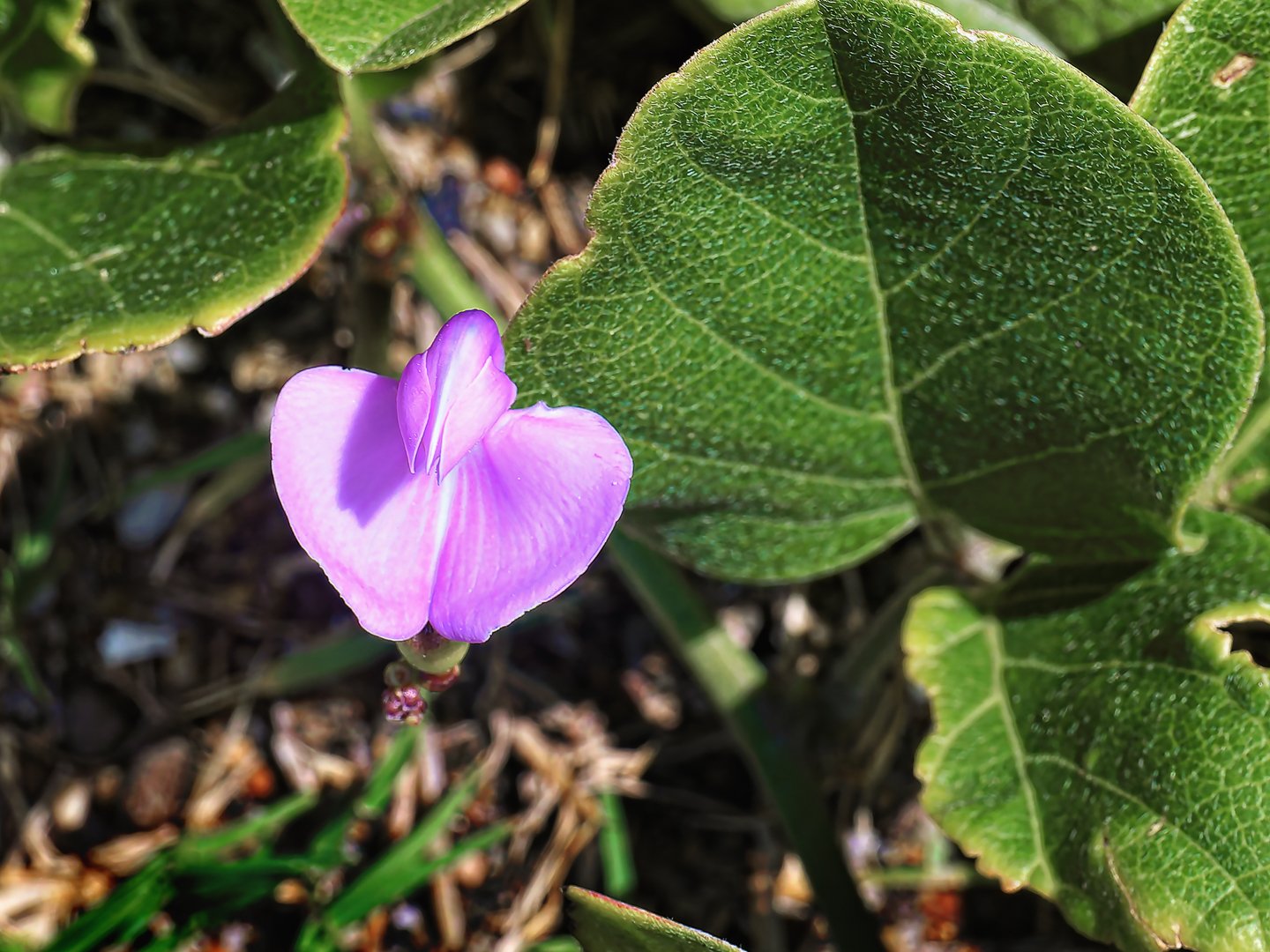 A delicate purple flower stands out among green leaves in a grassy area, illuminated by sunlight. The vibrant colors contrast beautifully against nature's backdrop.