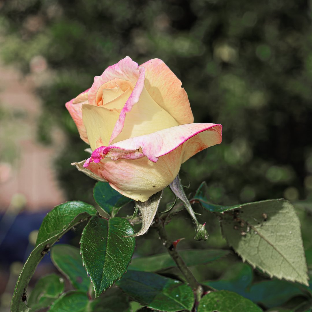 A stunning rose showcases soft yellow petals with delicate pink edges while blooming amidst lush green foliage in a garden setting during spring.