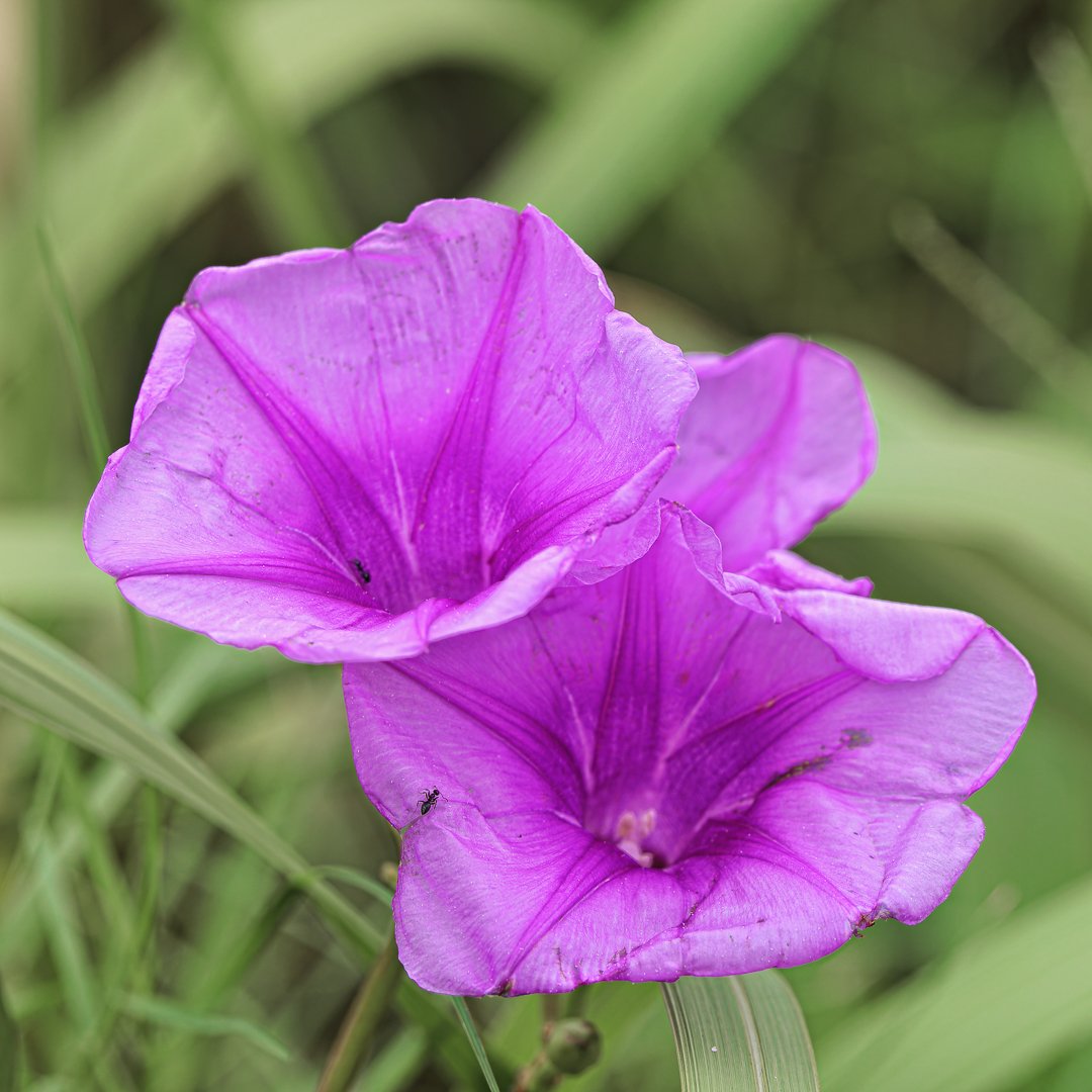 Two vibrant purple flowers open wide amidst green grass, showcasing their delicate petals under bright sunlight in a natural setting. Insects can be seen near the flowers.
