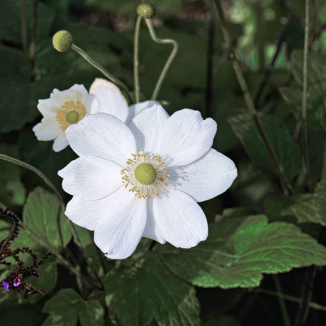 Delicate white flowers with yellow centers blossom amidst lush green foliage in a serene garden. The setting is peaceful, showcasing nature's beauty in full bloom.