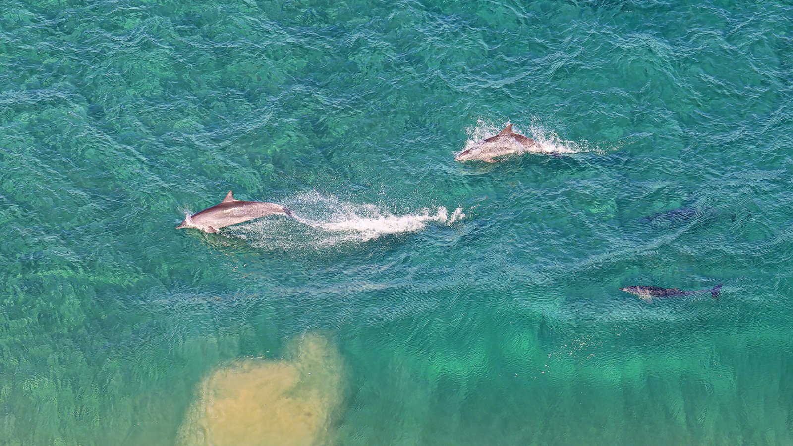 Three dolphins swim gracefully through clear turquoise waters close to shore. The sun reflects off the waves on a beautiful day, creating a vibrant atmosphere.
