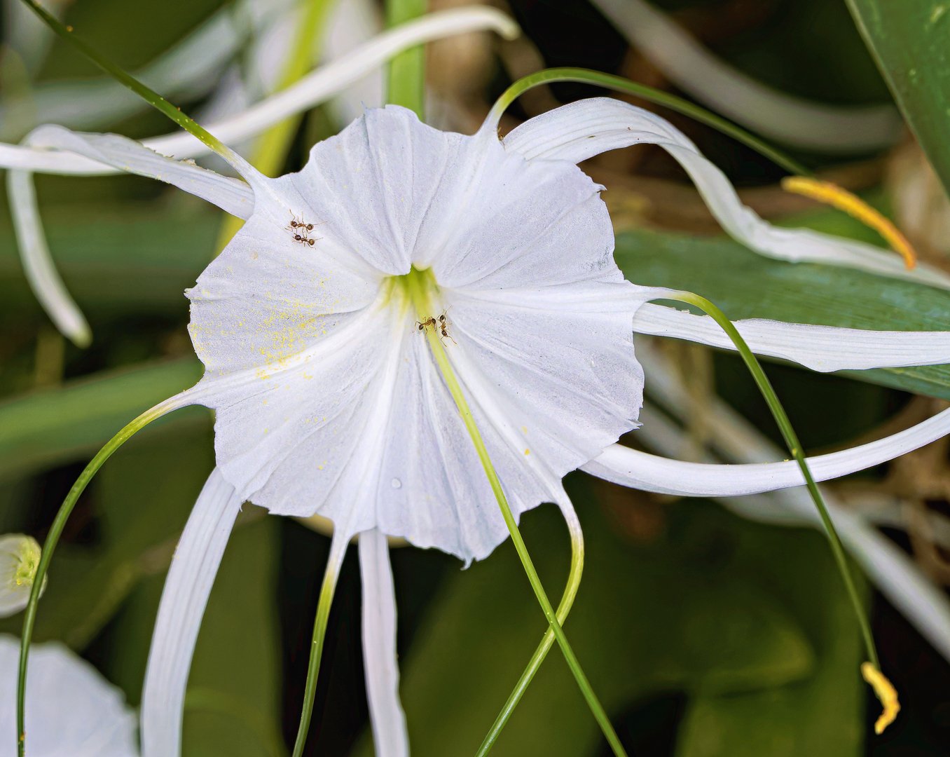 A beautiful white flower displaying long green tendrils attracts tiny ants exploring its petals. This vibrant scene captures nature's intricate details in a sunny garden.