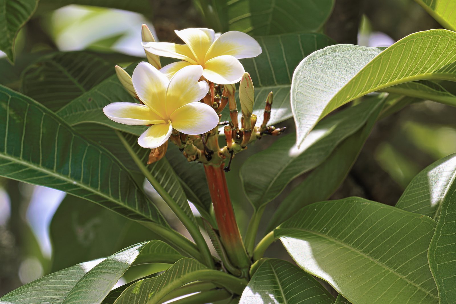 In a vibrant tropical garden, yellow plumeria flowers blossom prominently against dark green foliage, showcasing nature's beauty in full bloom on a sunny day.