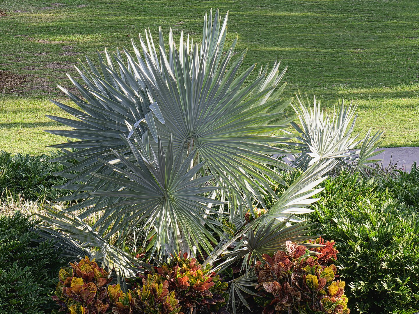 A vibrant garden features an arrangement of tropical plants with large, fan-shaped leaves, surrounded by colorful foliage under bright afternoon sunlight in a coastal area.