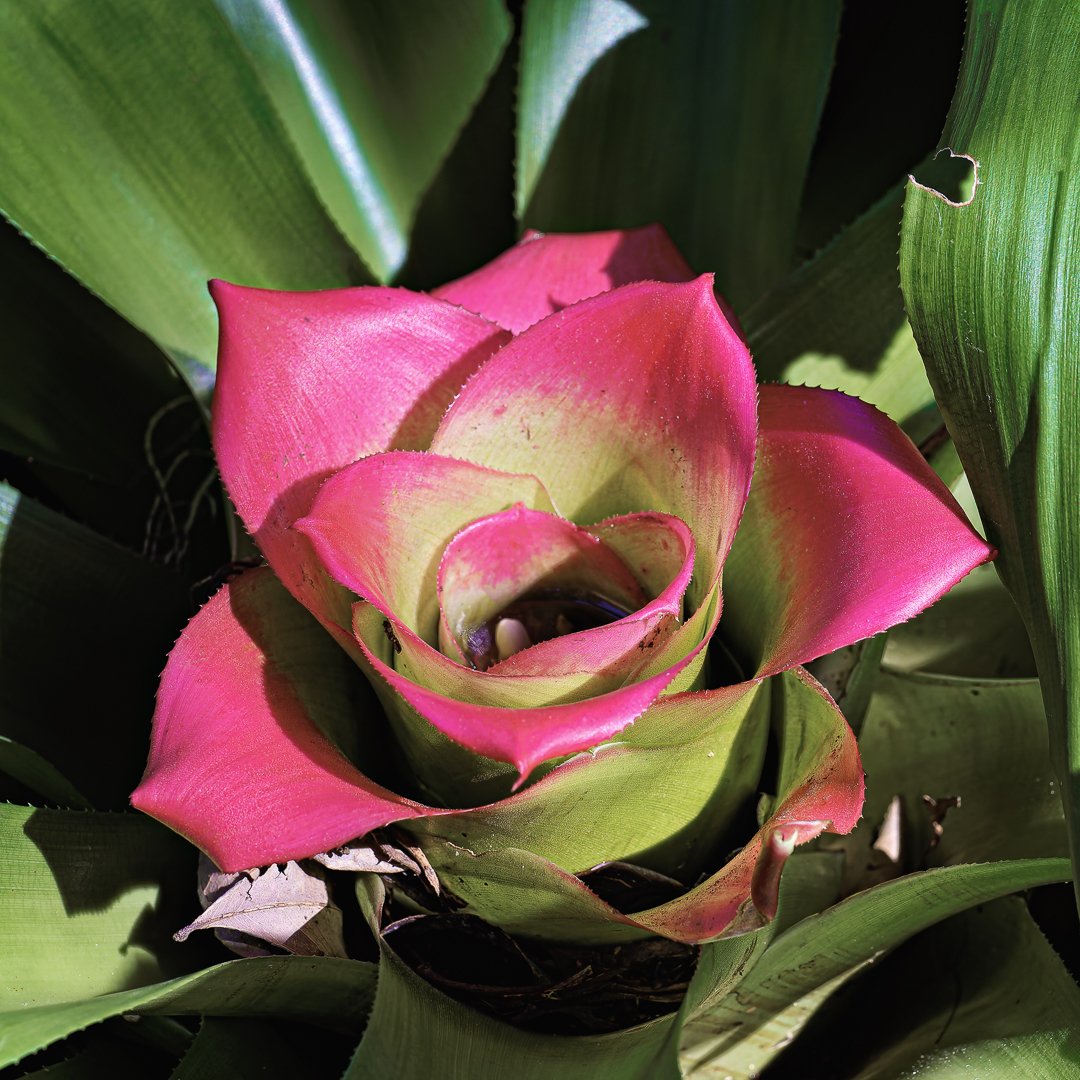 A vibrant bromeliad showcases its striking pink and green leaves nestled among broader green foliage in a well-tended garden during midday. The sunlight enhances its colors.