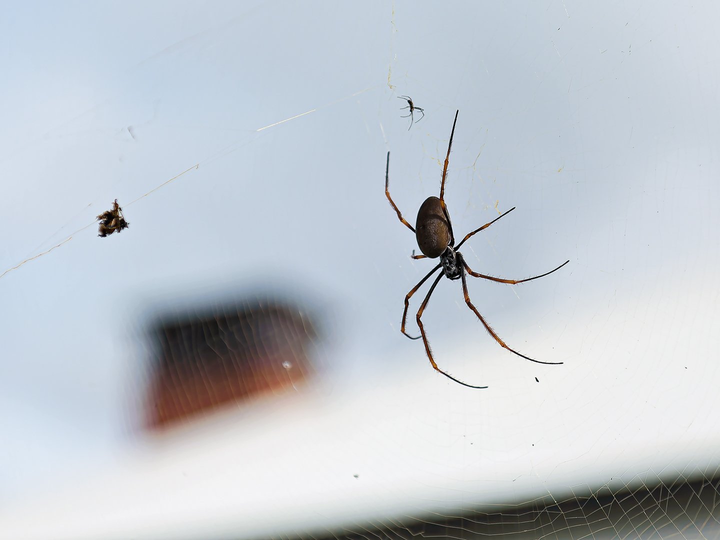 A spider is busy spinning its intricate web near the exterior of a house. The delicate threads glisten softly in the daylight, showcasing the creature's skillful work.