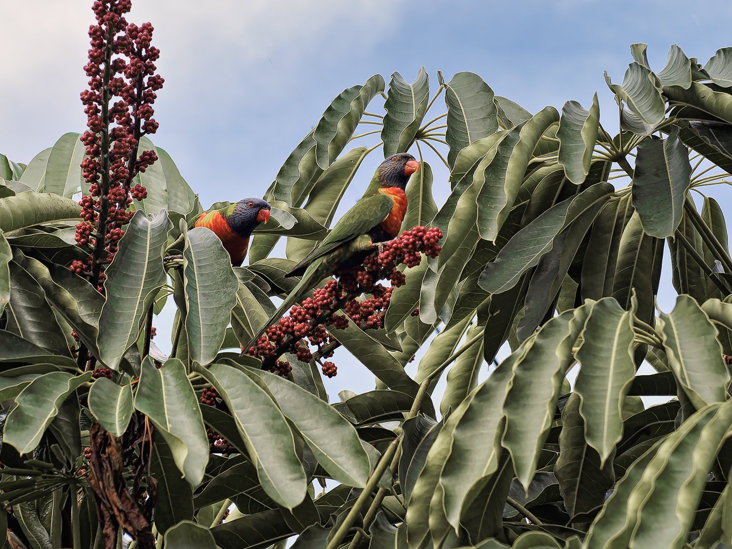 Two vibrant lorikeets are perched among rich green leaves, feasting on blooming flowers, creating a lively scene in a tropical setting under a clear blue sky.