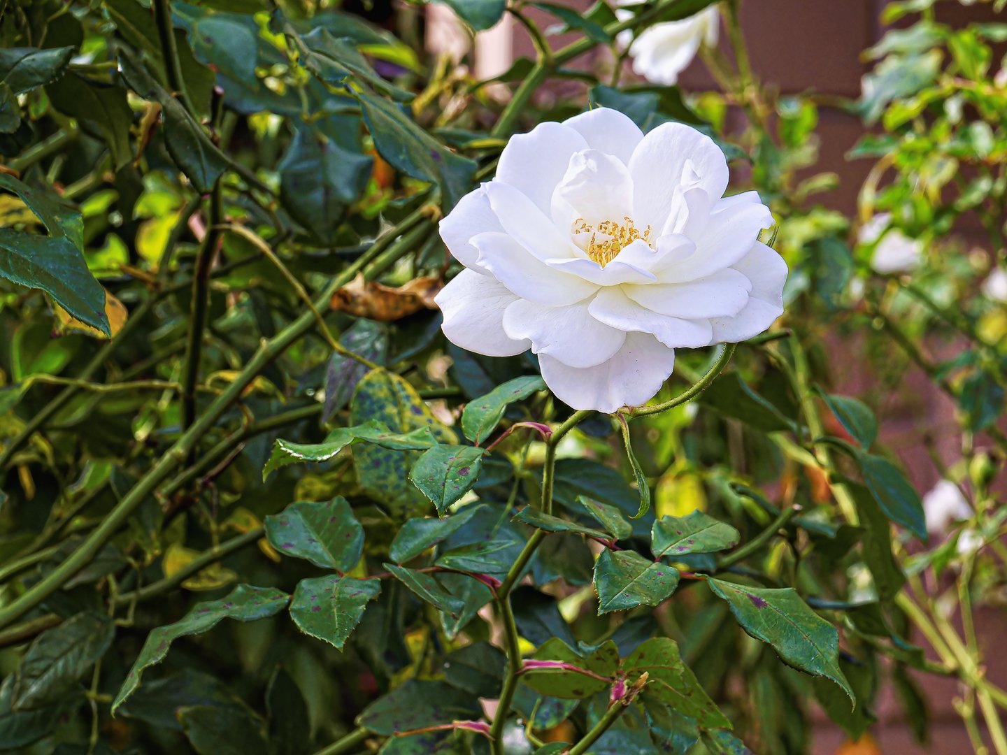 A stunning white rose opens its petals surrounded by vibrant green leaves. The gentle morning light highlights the beauty of this floral display in a peaceful garden.