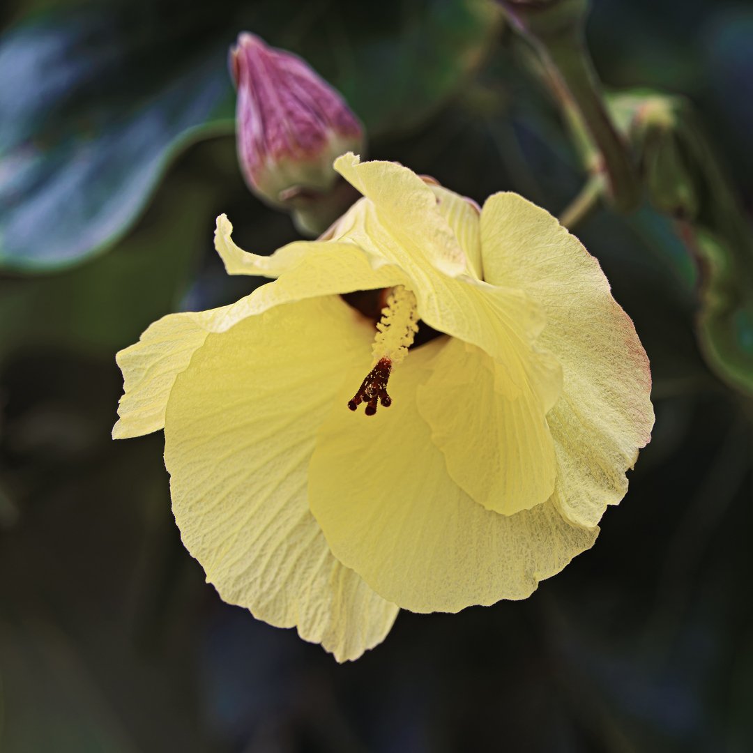A yellow hibiscus flower blooms gracefully in a lush tropical garden. The flower reveals its delicate petals and vibrant stamen, accompanied by budding flowers nearby.